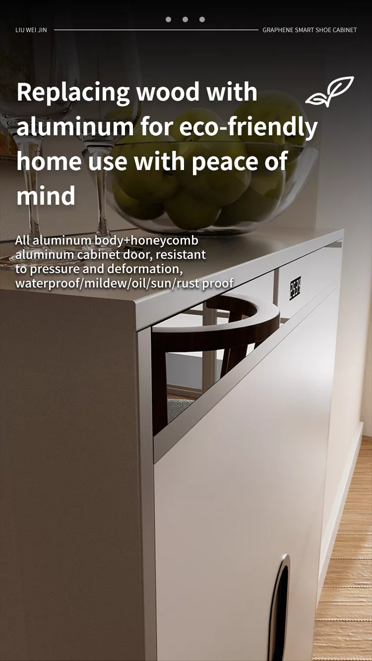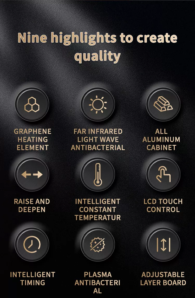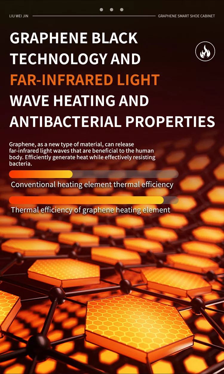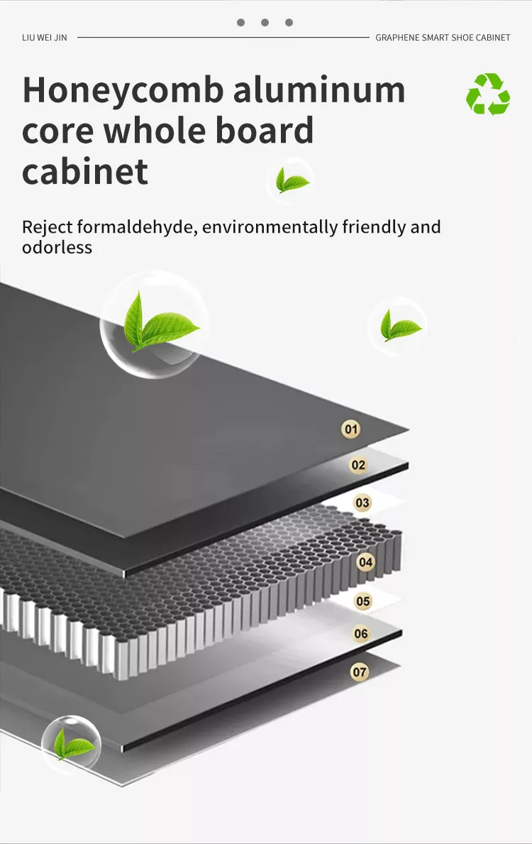 Som en pionjär inom grafenlivet upprätthåller Meshow konceptet "Nya material, ny teknik och nytt liv". Denna grafenelektriska värmestid för torkning av torkning är anpassat. Denna produkt använder grafenvärmeelement. Grafen är känd som svart guldmaterial, som är ett naturligt material som är separerat från kolatomer. Det har egenskaperna hos millisekund snabb uppvärmning, och grafen har långt infraröd ljusvågor som är fördelaktiga för människokroppen, vilket effektivt kan sterilisera under upphettning. På samma gång kommer det inte att få luften för torr och skada skorna. Den är utrustad med jonreningsmodul, som har deodoriseringseffekt. Intuitivt se temperaturen och arbetstiden, och också spara elektricitet för dig. Skoskåpet är tillverkat av höghållfast honungskaka aluminiumplatta, som är miljövänlig och formaldehydfri. Samtidigt har den hög bärbar kapacitet och kommer inte att mögel på grund av fuktigt väder. Det kommer inte att spricka på grund av långvarig uppvärmning.